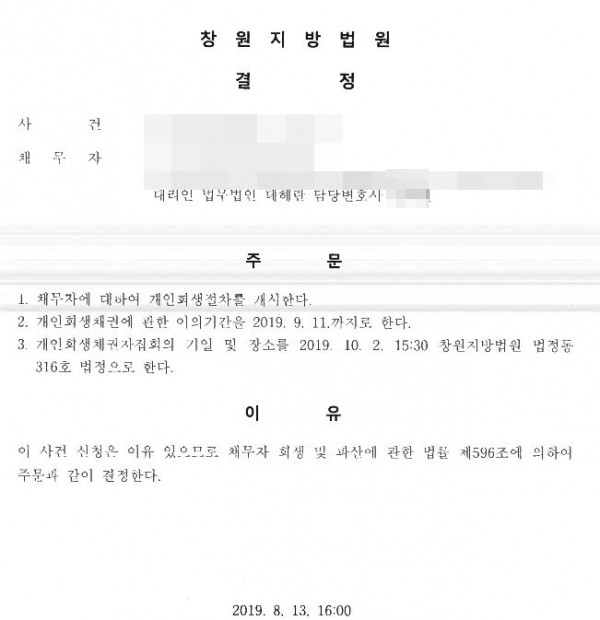 그 결과 의뢰인은 채무 총 8천 5백만 원 중 90%를 탕감받아 7천 6백만 원을 약 24만 원의 변제금을 36개월 동안 납입하는 조건으로 개인회생을 진행하셨습니다.