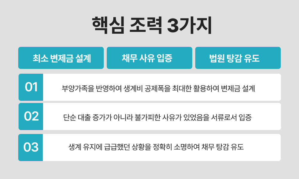 의뢰인의 소득이 적고 부양가족이 있는 점을 반영하여 생계비 공제폭을 최대한 활용하였고, 이를 통해 월 변제금 31만 원으로 낮추는 전략을 구성했습니다.